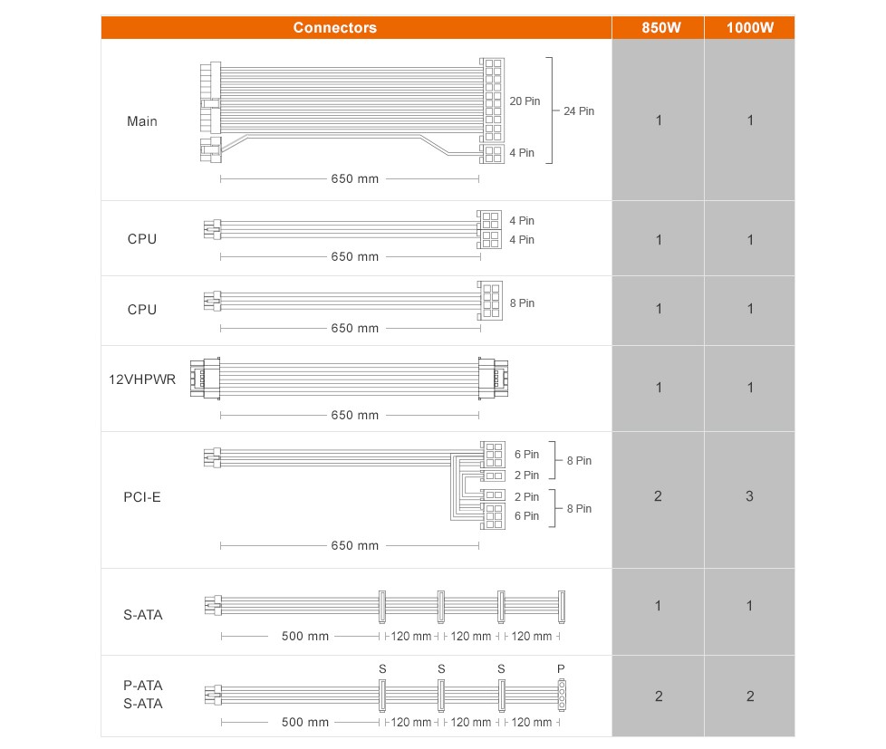Модульний 12+4-контактний кабель 12VHPWR забезпечує ідеальне живлення для відеокарт Nvidia GeForce RTX 40 Series. Без 6+2-контактного адаптера довжина 650 мм може знизити ризики під'єднання під час складання ПК.