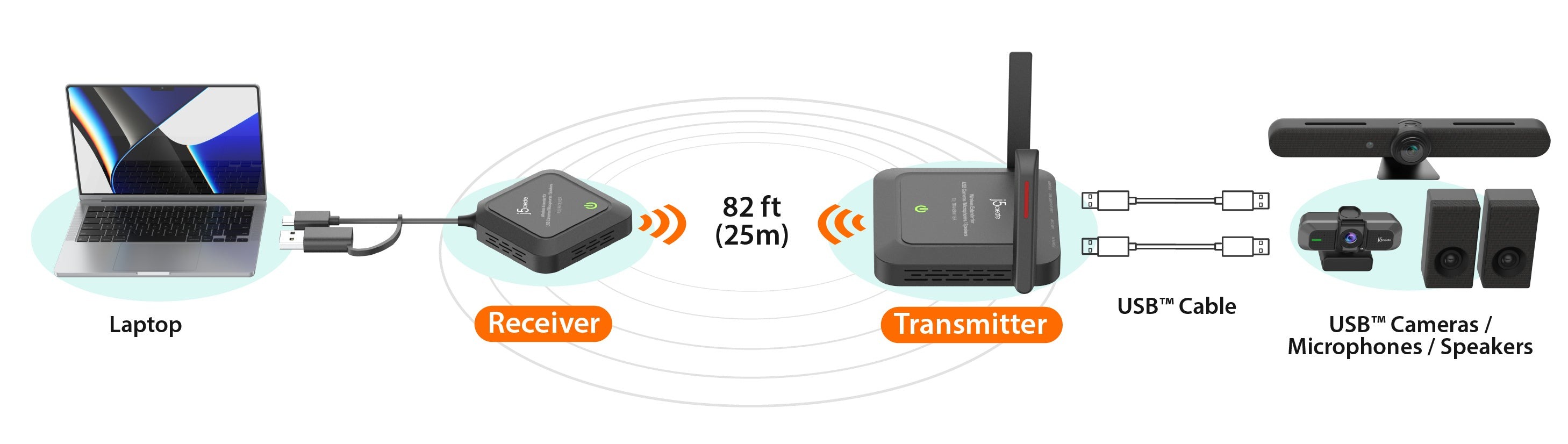 Бездротовий подовжувач j5create для камер USB™ перетворює вашу дротову камеру на бездротову. Завдяки діапазону бездротової передачі до 25 м користувачі можуть розширити діапазон своєї дротової камери USB™ без заплутаних кабелів, незалежно від планування приміщення. Окрім бездротової передачі відео та аудіо, цей компактний і легкий подовжувач для камери працює з пристроями Windows®, macOS® та Chrome OS™, що робить його чудовим доповненням до будь-якої кімнати для нарад, обладнання для стримінгу та інших подібних середовищ.