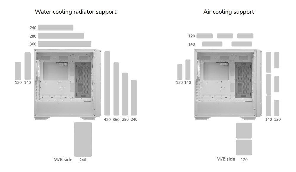 Завдяки підтримці водяного охолодження передньої панелі заввишки 420 мм або верхньої панелі заввишки 360 мм, ваша система буде оптимально охолоджуватися навіть під час виконання ресурсоємних завдань.