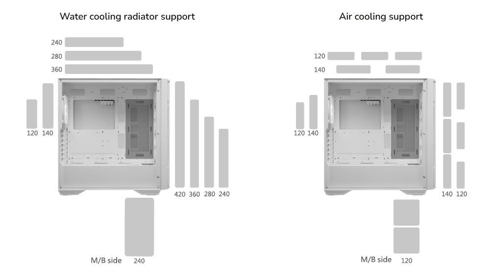 Завдяки підтримці водяного охолодження передньої панелі заввишки 420 мм або верхньої панелі заввишки 360 мм, ваша система оптимально охолоджуватиметься навіть при виконанні ресурсомістких завдань.